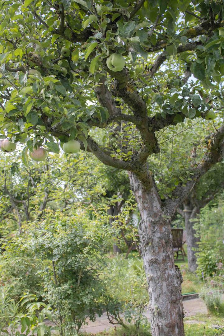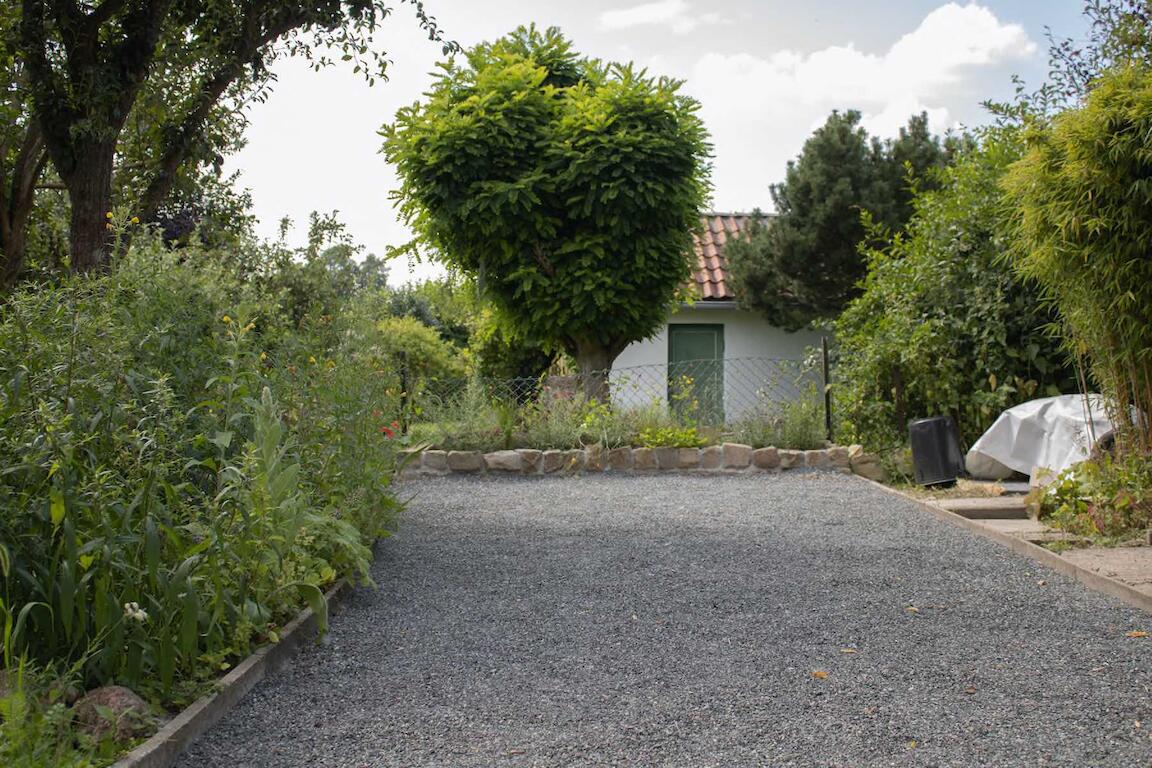 Vom Eingang aus gesehen besteht der 400 Quadratmeter große Garten nun aus drei Teilen: Wer das Tor passiert und auf dem Steinweg steht, findet zu beiden Seiten jeweils eine kleine Wiese mit Apfelbäumen und einer Sitzgelegenheit. Am Ende des Wegs steht ein Häuschen mit einer hölzernen Bank davor. Links fällt der Blick dann auf eine selbst angelegte Boule-Bahn, rechts wartet ein kurzer mit Wein berankter Laubengang. Direkt am Weg und an den Zäunen haben Janko Woltersmann und seine Frau allerlei Beete angelegt. Hier blühen etwa Salbei, Rosen und verschiedene Kräuter, an anderen Stellen wachsen Auberginen, gelbe, grüne und schwarze Bohnen, Erbsen und Radieschen.