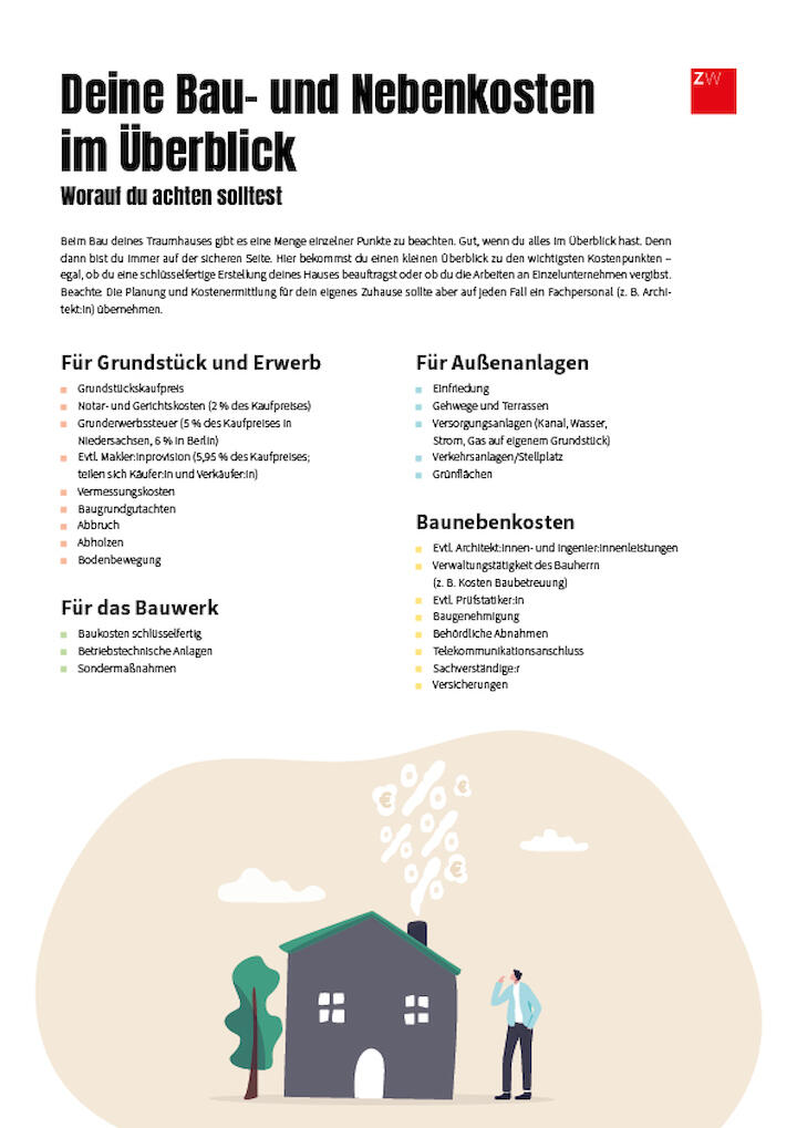 Die Nebenkosten, die eine Immobilienfinanzierung mit sich bringt, fallen bei der Planung gerne mal unter den Tisch. In diesem PDF findest du deine Bau- und Nebenkosten im Überblick. So bleibst du vor bösen Überraschungen gefeit.