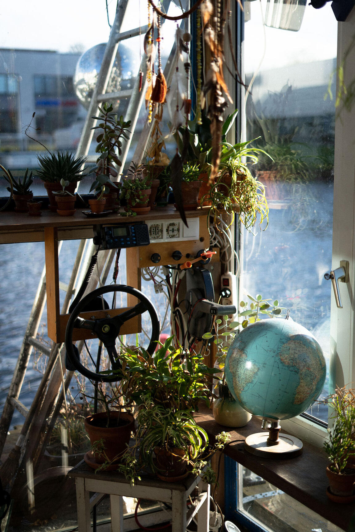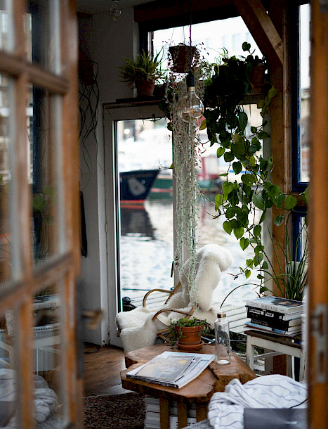 Ich öffne die Tür und atme einen Duft aus Holz und Harz ein. Überall hängen und stehen Pflanzen, die Sonne scheint durch die vielen Fenster und in der Ecke steht ein Sofa mit bunten Kissen. Ich entdecke winzige, hübsche Details und fühle mich wie in einem Instagram Post mit den Hashtags #interiordesign und #urbanjungle. Als ich mich aus meinen Winterschuhen arbeite, bewegt sich der Boden. Denn, das sollte ich an dieser Stelle erwähnen: Ich bin auf einem Hausboot. In den nächsten 24 Stunden möchte ich ein Gefühl dafür bekommen, wie es wäre, hier zu leben.
